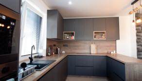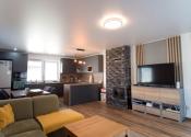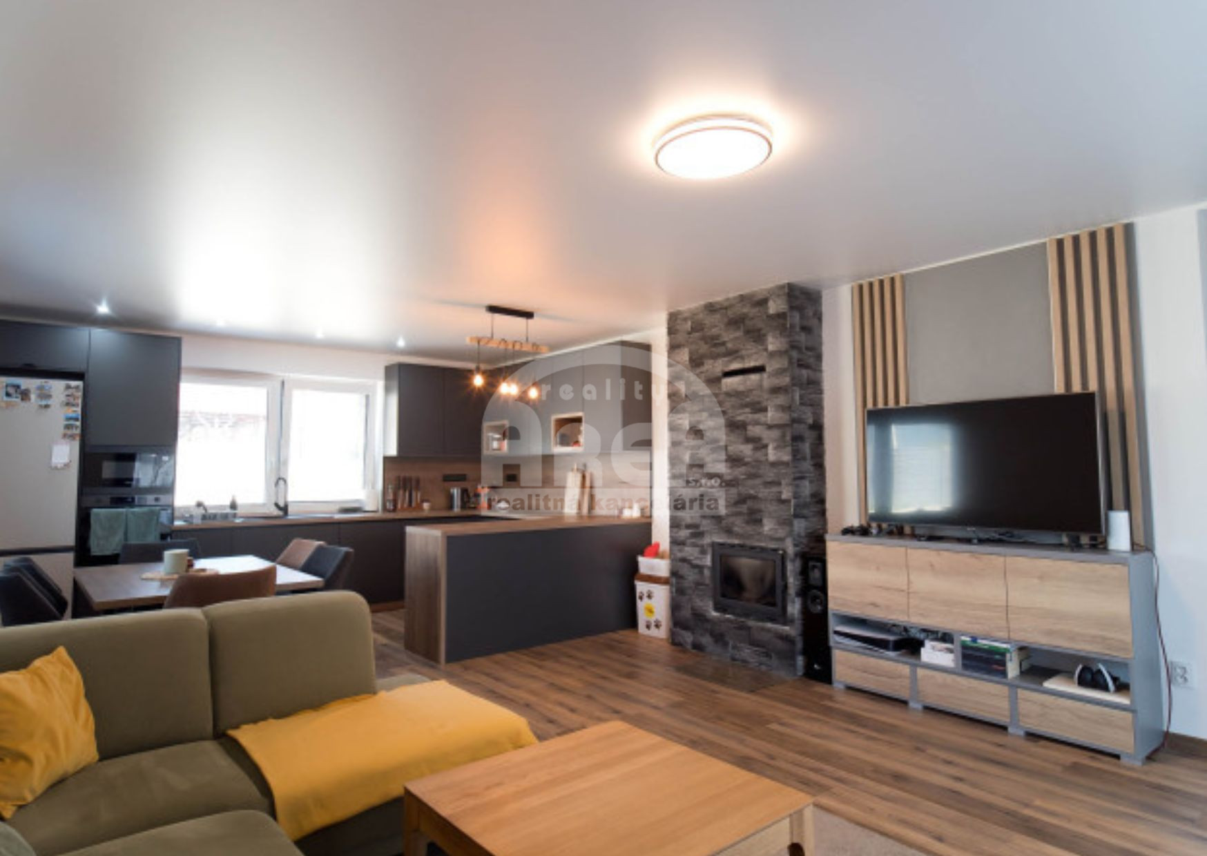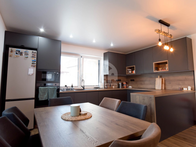 - priestranná moderná kuchynská linka so vstavanými spotrebičmi a jedálenským stolom pre príjemné rodinné stretnutia